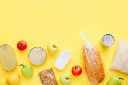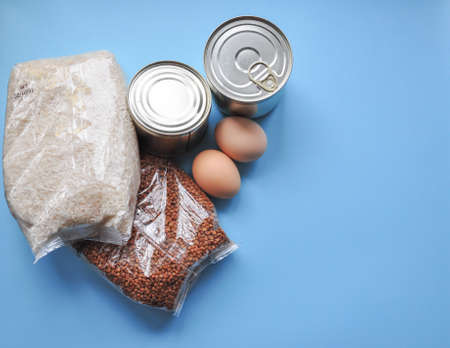 Set of grocery items from canned food, vegetables, cereal. Food delivery concept. Donation concept. Top view.