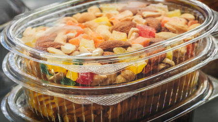 assortment of dried fruits and nuts in transparent packing on the shop shelf.