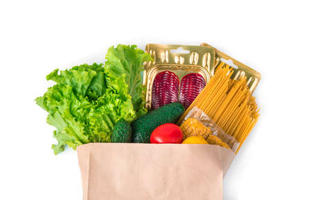 Fresh food in a kraft bag is isolated on a white background. Side view, product purchase concept.