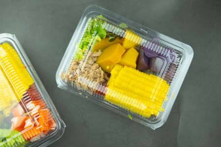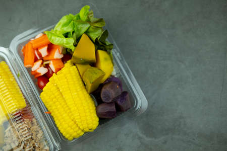Many of fresh chopped fruits and vegetable for eating healthy salad in plastic box. Clean eating concept