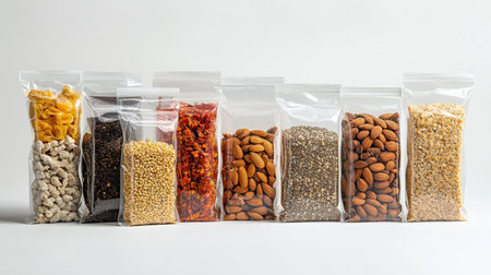 A vibrant selection of packaged food ingredients displayed in clear bags, featuring nuts, seeds, and spices. Perfect for cooking and healthy snacking.