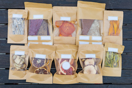 Dried fruits packaged in eco-friendly paper bags. Healthy desserts concept. Natural substitutes for sugar in the diet.