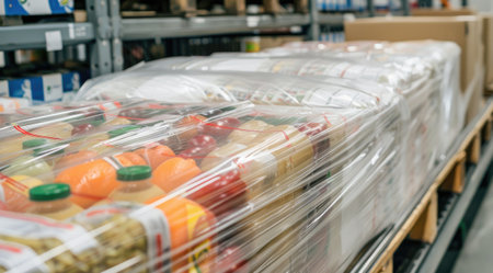 Pallet of wrapped food products in warehouse