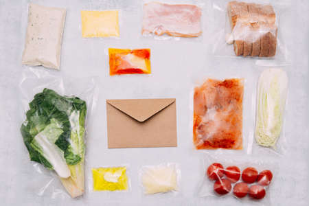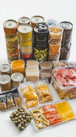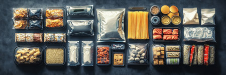 AI Generated. Many different food in vacuum packings on table, top view