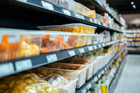 A busy supermarket aisle filled with a variety of products neatly arranged on shelves. The image captures the essence of retail shopping and consumerism, ideal for themes related to commerce and daily life.