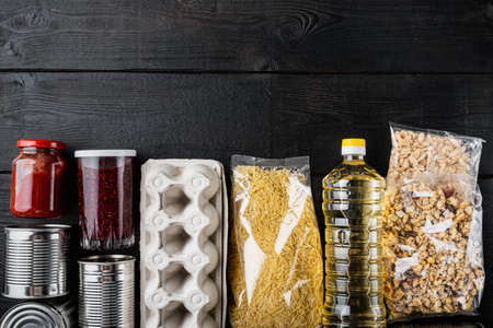 Set of food products. Food supplies. Donation, coronavirus quarantine concept, top view with copy space, on black wooden table