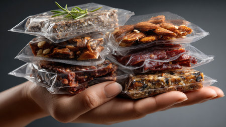 A hand carefully holds a selection of assorted healthy snack bars, each wrapped in clear plastic. These bars feature a variety of nutritious ingredients, showcasing a blend of flavors and textures perfect for a quick energy boost.