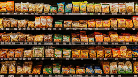 Display of various snack packages on grocery store shelves showcasing a range of flavors and options for shoppers seeking healthy or indulgent choices.