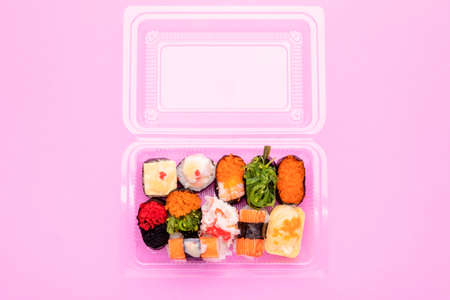 Top view Japanese food (sushi) in clear plastic food box on pink background