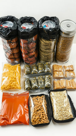Freeze-dried meals, canned meats, and vacuum packed rice are part of this survival food kit, set on a white concrete surface, banner
