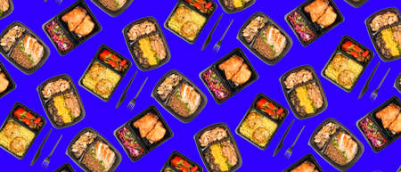 Plastic boxes with tasty food for delivery on blue background