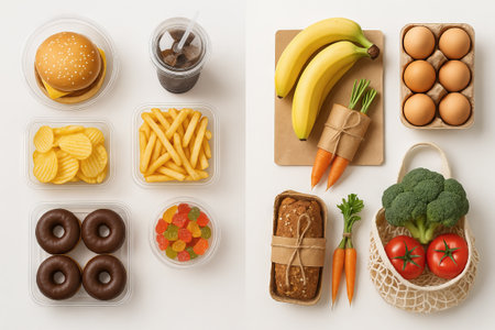 Comparison of fast food and organic produce on white background. concept of nutrition balance, healthy vs unhealthy choices, lifestyle.
