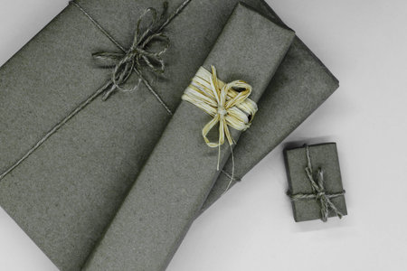 Composition of grey gift boxes wrapped in paper and bundled with different ribbons on grey background