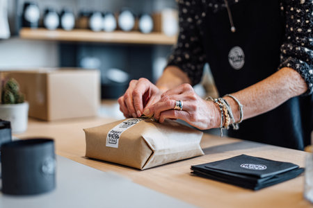 cropped shot of caucasian barista packing food in paper bag