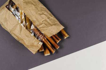 Pet treats in a paper bag with transparent window. Dental treats on gray and white background. Bully sticks. Beef pizzle for dog. Natural air dried chewing sticks. Top view