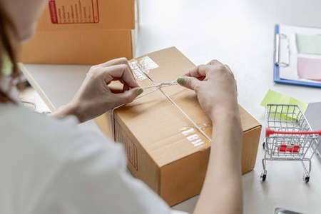 An Asian woman tying a parcel to a customer's box, she owns an online store, she packs and ships through a private transport company. Online selling and online shopping concepts.