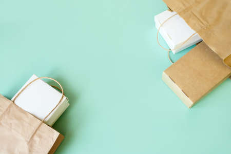 Paper packaging on a green background. Zero waste. Copy Space