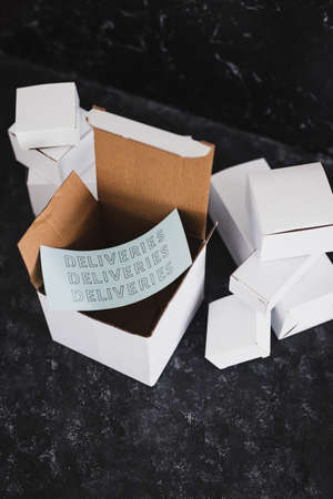 shipping industry and online shopping concept, group of white delivery parcels with Deliveries Deliveries Deliveries text