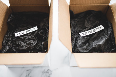 Low stock and out of stock texts inside of empty delivery parcels with black padding on white background, concept of supply chain shortages and delays after the covid-19 global pandemic