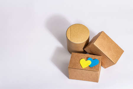 The concept of helping Ukraine in the war. Boxes with hearts in the colors of the Ukrainian flag isolated on a white background. Modern hard light, dark shadow