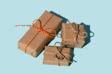 presents wrapping and packaging. holiday traditions and handcraft. gift boxes in craft paper and tied with yellow twine on blue background.