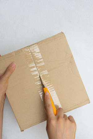 Unboxing the courier box with a cutter knife