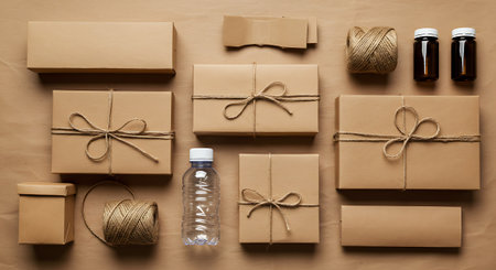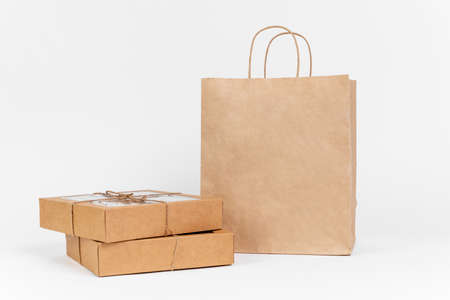 Two boxes of recyclable cardboard are tied with twine and stand next to a craft paper bag, ready for delivery. Packaging of goods for an online store, copy space, studio shooting