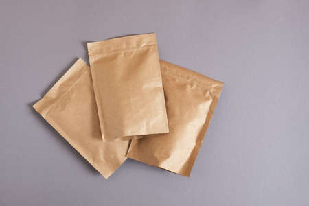 mock up blank paper bag on gray background Eco friendly packaging, paper recycling, zero waste, natural products concept. copyspace.