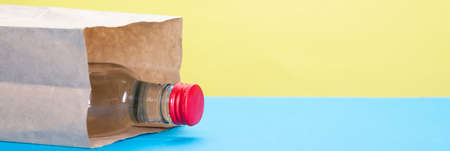 Alcohol bottle with red cork in paper bag on yellow and blue background.