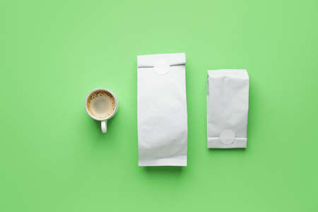 Stock foil paper bag for tea, coffee and grain packaging. Retail shopping and advertising concept. Aluminium coffee package.