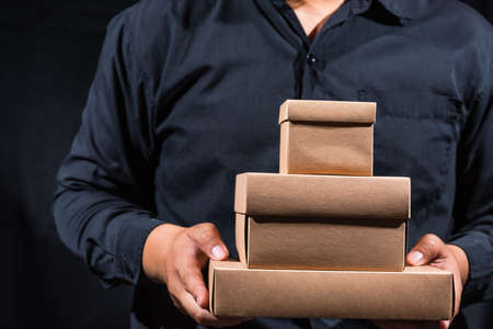 a man holding stack of different size craft boxes on black background