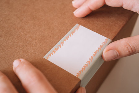 Hands showcase delicate movements while placing a fragile sticker on a small brown box amid a warm and inviting setting during daylight.