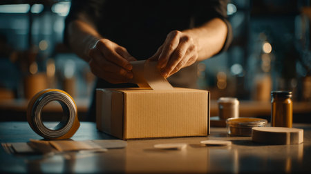 Crafting and packaging items with care, person green apron applies yellow tape to small brown box green cutting mat. workspace is organized with additional boxes and tools nearby, creating