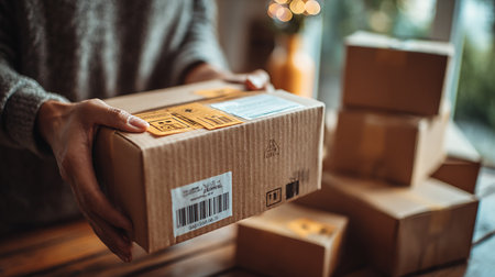 Close up image of a delivery package with shipping labels, representing shipping, logistics, and parcel handling.