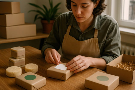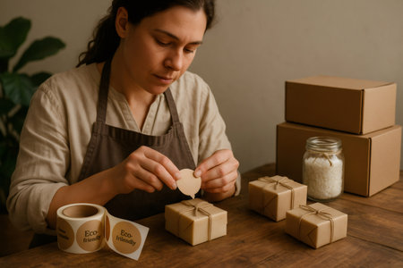 Small business owner placing eco friendly labels on packages, promoting sustainable and environmentally conscious practices