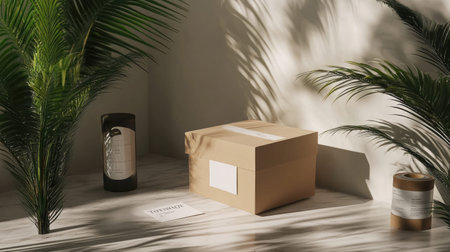 A serene indoor scene showcasing a brown cardboard box among lush green plants, casting gentle shadows on a wooden table, perfect for a cozy atmosphere.