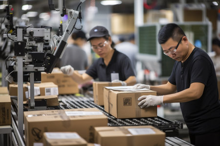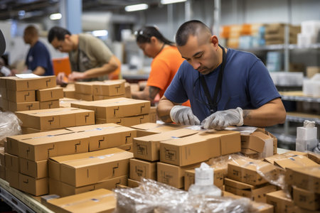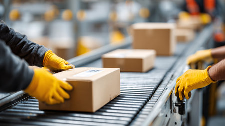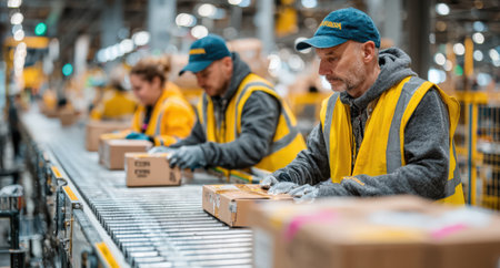 Diverse team of warehouse workers in safety vests packing boxes on conveyor belt, demonstrating collaboration and efficiency in a bustling distribution center