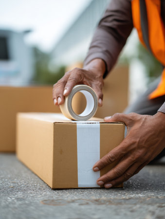 Worker carefully tapes a label onto a building adhesive box on a soft background, focused on organizing products for distribution.