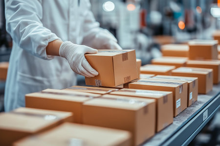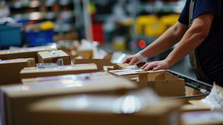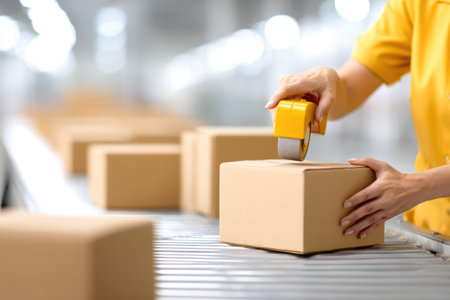 Close-up of a worker packing boxes on conveyor belt in warehouse