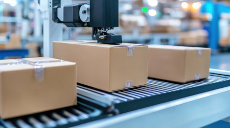 This image captures a modern packaging process with sealed brown boxes on a conveyor belt, showcasing efficiency and automation in warehouse operations.
