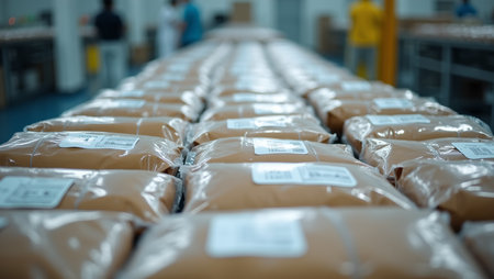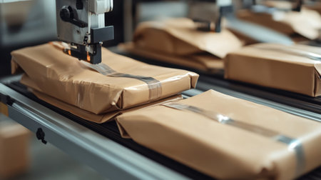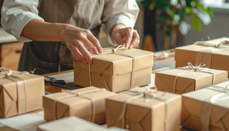 Medium shot focusing on the assembly of biodegradable mailers and ecopacked parcels illustrating innovative sustainable packaging in clean organized shipping operations.