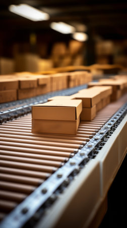 Boxes on conveyor belt in warehouse. Shallow depth of field