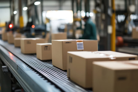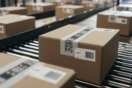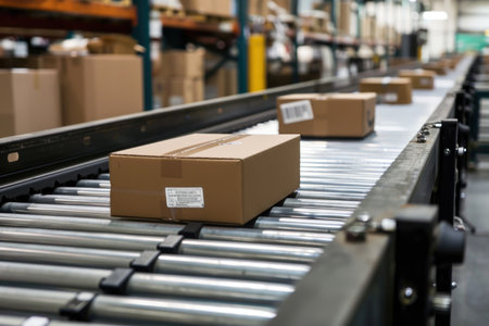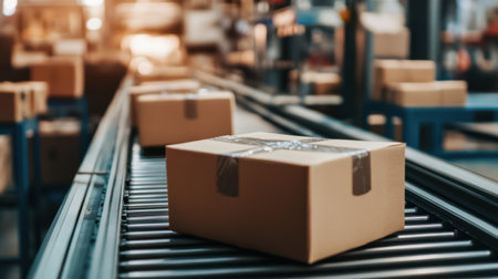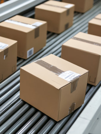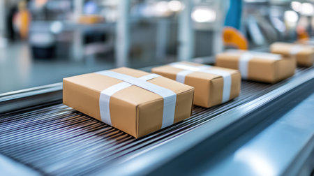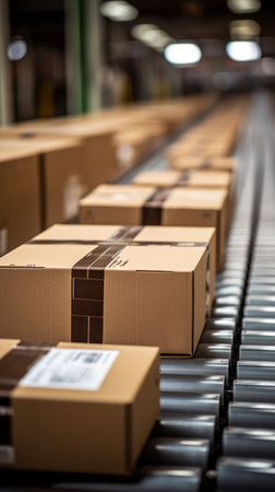 A close-up view of packages moving along a conveyor belt in a warehouse, showcasing modern logistics and streamlined operations for efficient delivery and transportation solutions.