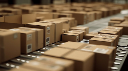 Cardboard boxes on the conveyor line of a sorting center. AI generative