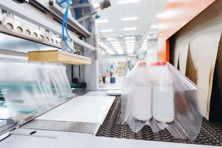 A close-up view of sealed pouches on a conveyor belt in a production facility. This image showcases the modern packaging process and machinery involved.