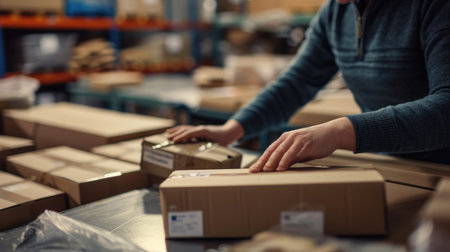 Close-up of delivery person packing box for customer in the workshop