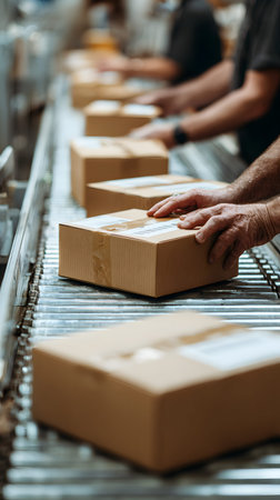 Close-up of workers hands holding cardboard boxes on conveyor belt
