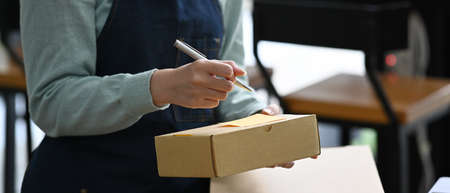 Closeup view of female online store small business owner seller entrepreneur packing package post shipping box preparing delivery parcel.