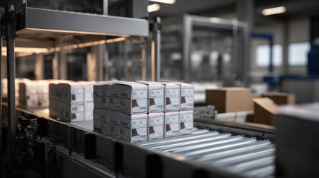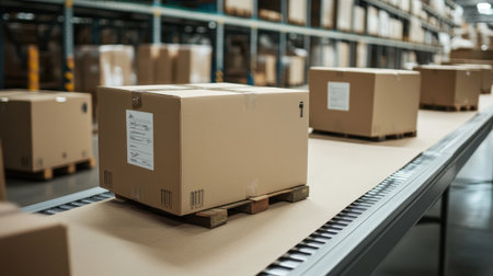 A modern warehouse environment showcasing cardboard boxes on a conveyor belt, highlighting efficient logistics and storage management within an organized stockroom setting.