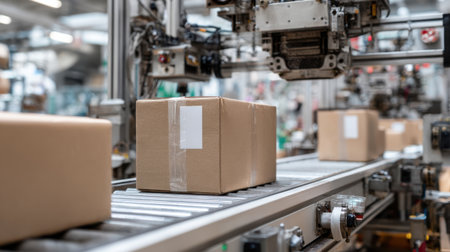 Generative AI cardboard box of product packaging is moving on conveyor belt of automatic packing machine in the manufacturing factory